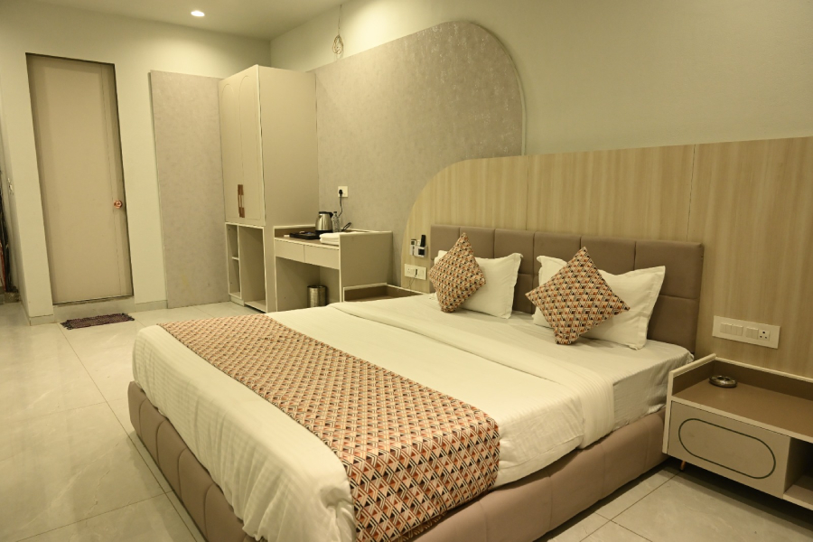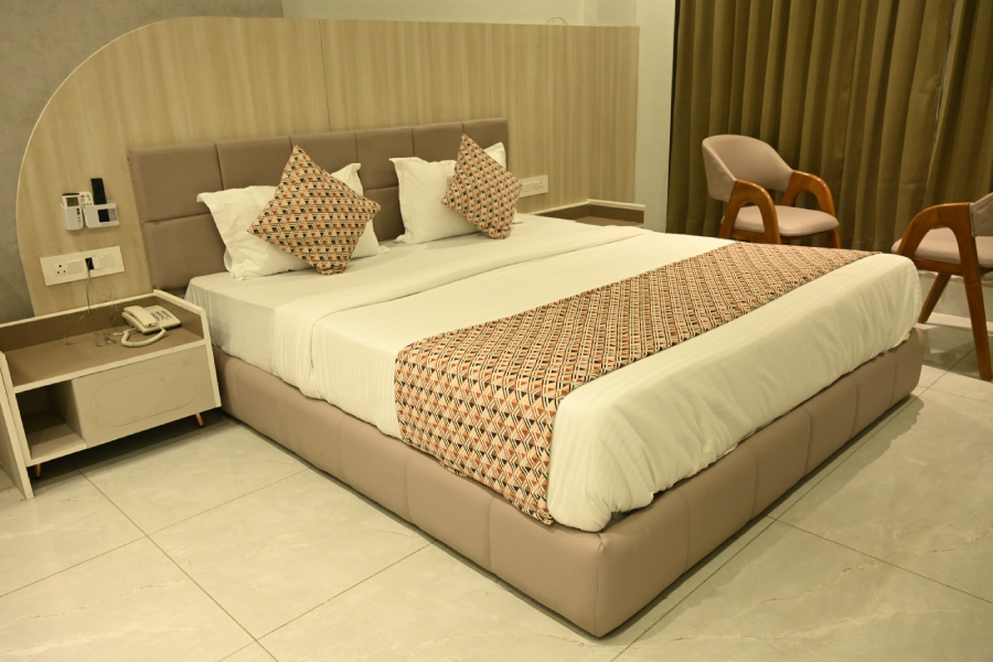 The Deluxe Rooms at Hotel Shree Khodal are thoughtfully designed to offer a spacious, comfortable, and relaxing stay experience for every guest. Each room features elegant interiors, cozy bedding, modern furnishings, and a calm ambiance that helps you unwind after a long day of travel or work. Guests can enjoy essential amenities, ample lighting, clean and well-maintained spaces, and attentive room service to ensure maximum comfort throughout their stay. Whether you are visiting for business, leisure, or family travel, our Deluxe Rooms provide the perfect balance of style, convenience, and relaxation, making your stay at Hotel Shree Khodal truly pleasant and memorable.